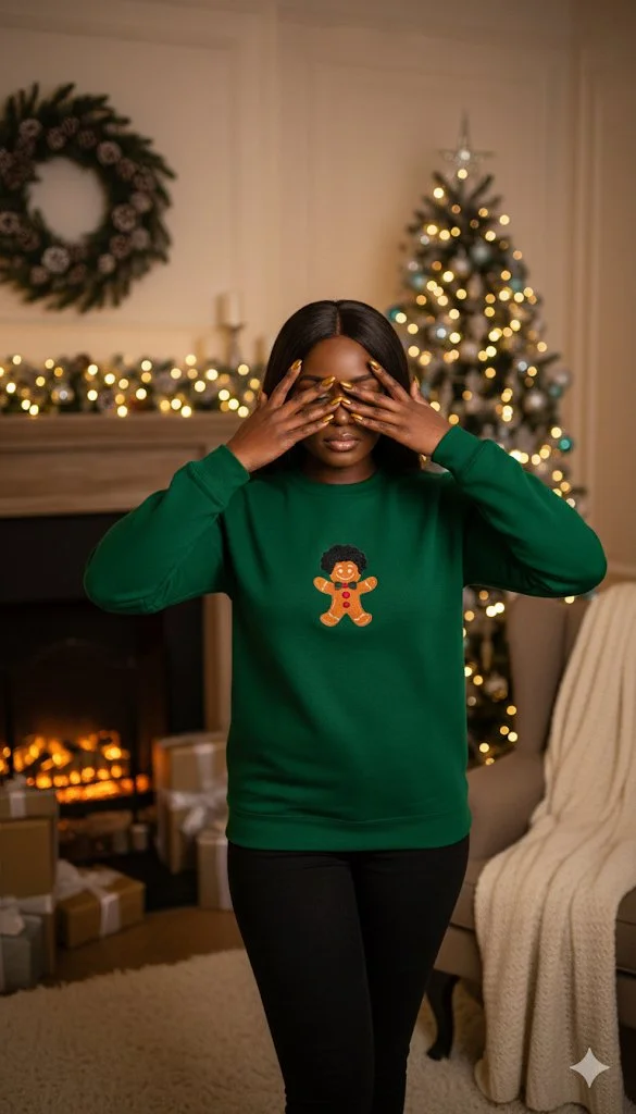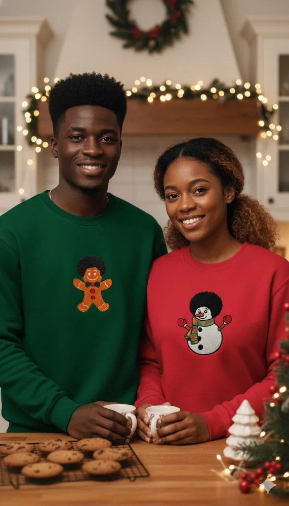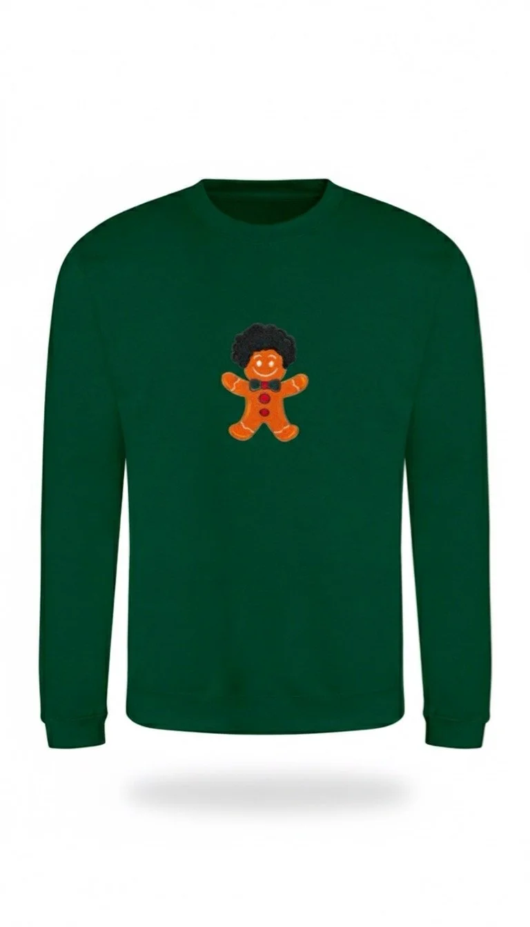 The bespoke Afro snowman proudly features on a popping festive red jumper, making the delicate soft chenille design with an intricate kente cloth scarf feature impossible not to love.